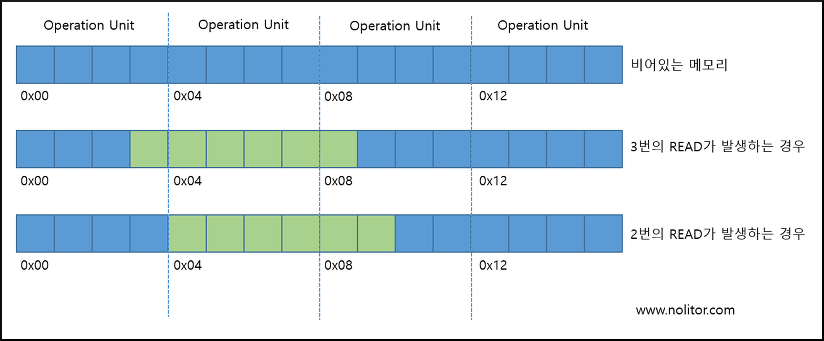 아래의 그림에서 연산단위에 정렬된 경우에는 2블럭만 읽으면 되지만,