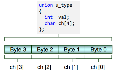 아래의 공용체는 int로도 해석할 수 있고, char[4]로도 해석할 수 있으므로,