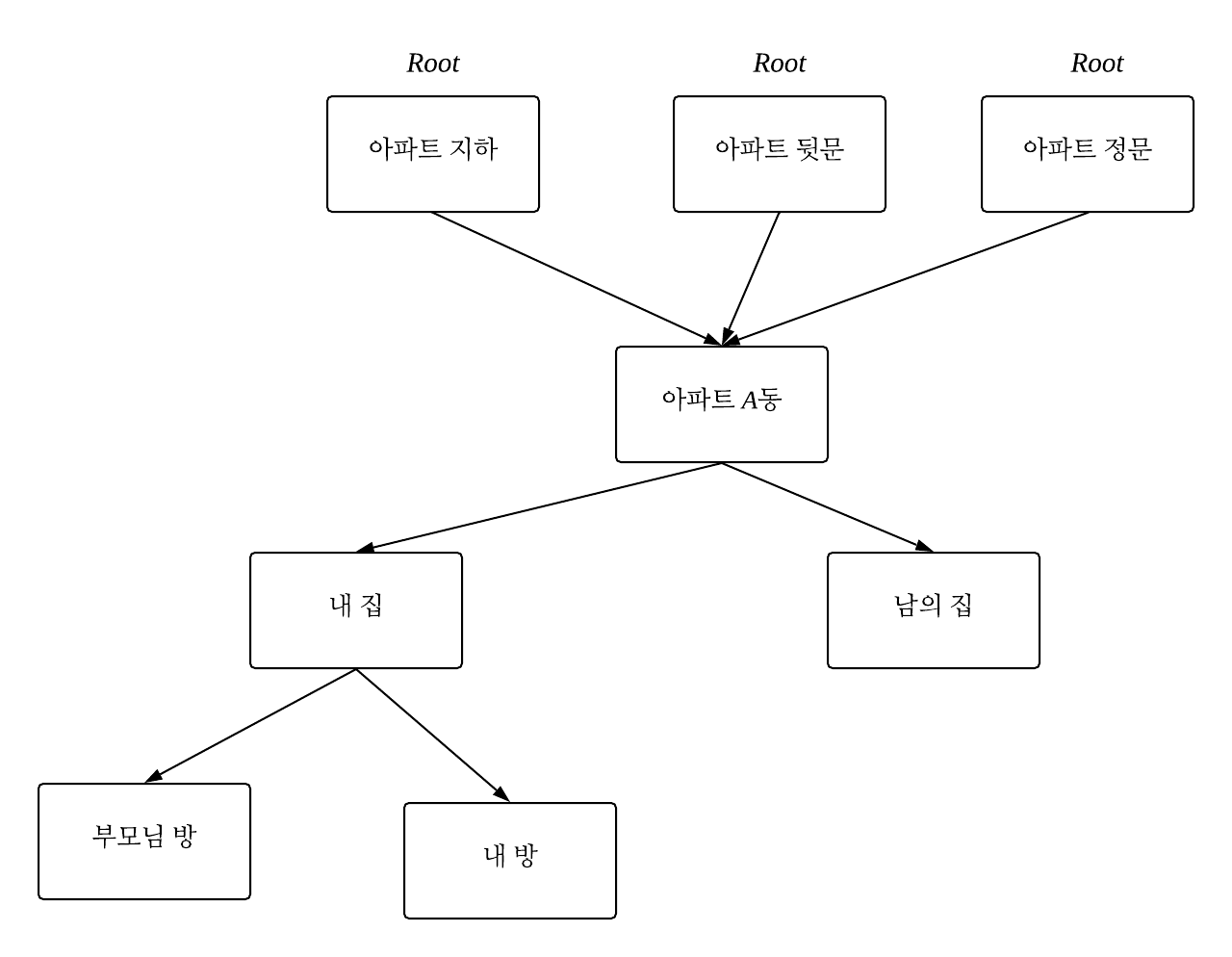 내 방의 문에 바로 갈 수 없기 때문에, 아파트 정문 또는 아파트 후문부터 시작해야 하죠. 이런 시작지점의 역할을 하는 오브젝트를 루트 오브젝트라고 부릅니다.