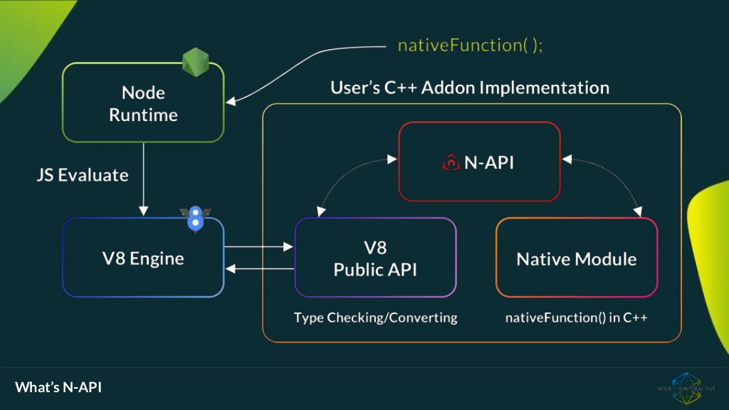 V8코드도 N-API를 사용하고, 우리가 작성할 C/C++코드도 N-API를 사용하기 때문에, 새로운 V8이 나오더라도 그 엔진이 N-API를 사용하도록 노드팀이 재설계해준다면, 우리는 아무것도 할 필요가 없어지는 것이죠. 이것이 V8의 밑바닥을 추상화Abstraction of the underlying JavaScript engine하는 것의 의미이고, N-API의 기본 원리이며, Node.JS에 빌트인된 이유입니다.