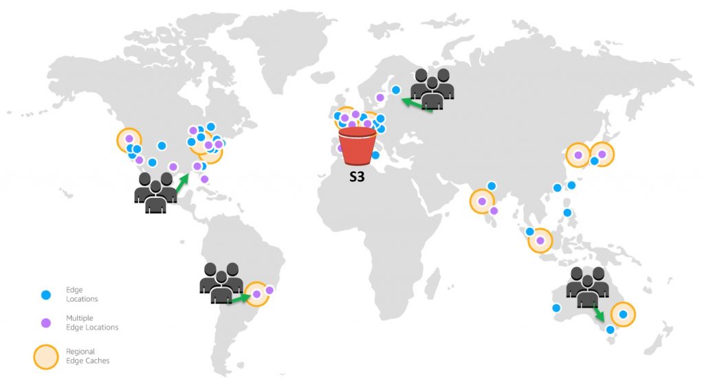 S3에 저장된 파일들을 각 엣지 로케이션에 캐싱합니다. 유저가 웹서비스에 접근하면 가장 가까운 엣지 로케이션에서 캐싱된 파일을 가져오기 때문에 응답시간을 최소화할 수 있습니다.