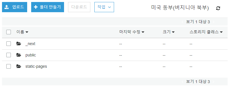 NextJS가 Production모드로 생성한 파일들을 저장합니다. 리전이 버지니아 북부로 되어있지만 다음에서 설명할 서비스인 CloudFront를 통해 엣지 로케이션으로 전파되기 때문에 리전은 어디라도 괜찮습니다.