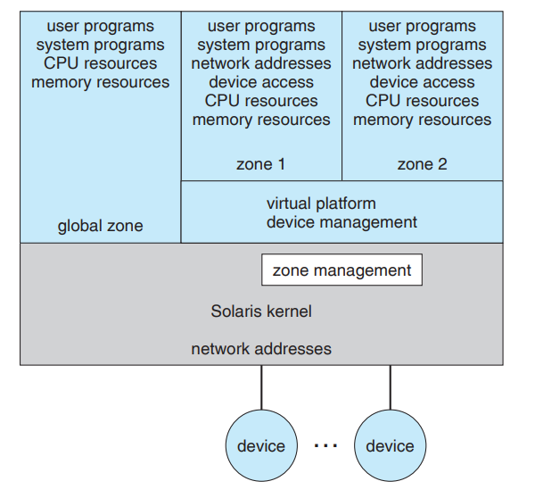 바로 하드웨어를 사용하는 호스트를 전역 영역(Global Zone)이라고 부르며 하이퍼바이저를 경유하는 호스트를 컨테이너(Container) 또는 일반 영역(Zone)이라고 부릅니다. 아래는 2개의 컨테이너를 거느리는 솔라리스의 모식도입니다.