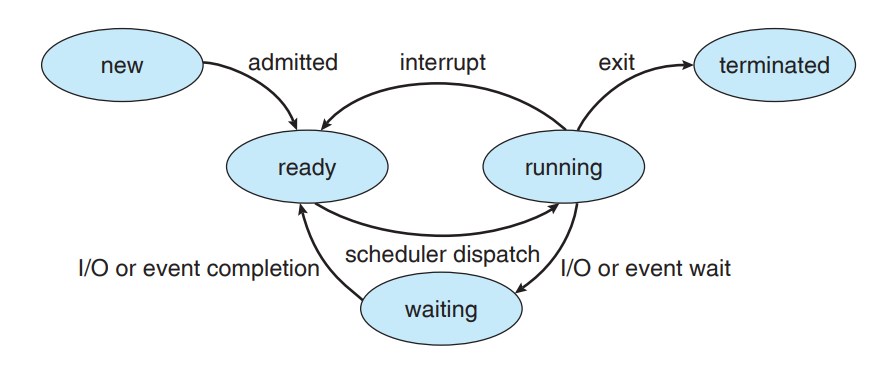 생성 (New): 프로세스가 생성 중 입니다.실행 (Running): 해당 프로세스의 명령어가 실행 중 입니다.대기 (Waiting): 입출력의 완료 신호를 기다리고 있습니다.준비 (Ready): 프로세스의 실행 순번이 오길 기다리고 있습니다.종료 (Terminated): 프로세스가 종료되었습니다.