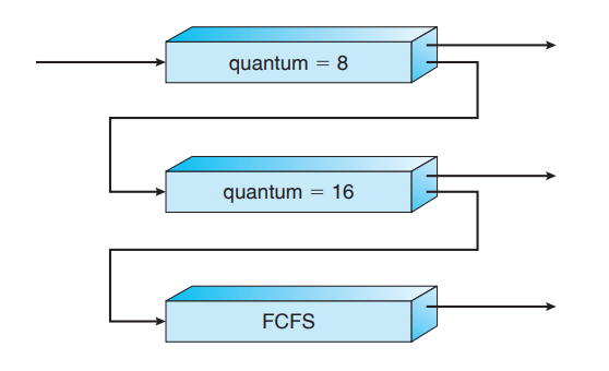 RR로 구성된 큐를 생각해봅시다. 처음에는 Q=8에 삽입하여 짧은 퀀텀을 주다가, 생각보다 작업이 커서 오래 살아남는 것 같다면 Q=16로 이동시켜서 퀀텀의 크기를 늘려보고, 이래도 끝나지않으면 아예 FCFS로 이동시켜서 더 이상의 선점없이 작업을 끝낼 수 있습니다.