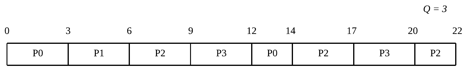 먼저 P0을 주어진 시간만큼만 실행하고, 그 다음으로 먼저 들어온 P1을 실행합니다. P1은 3초만으로 충분하므로 실행된 뒤에는 대기 큐에서 빠져나갑니다. 이것을 반복하면 다음과 같은 타임라인이 만들어집니다.