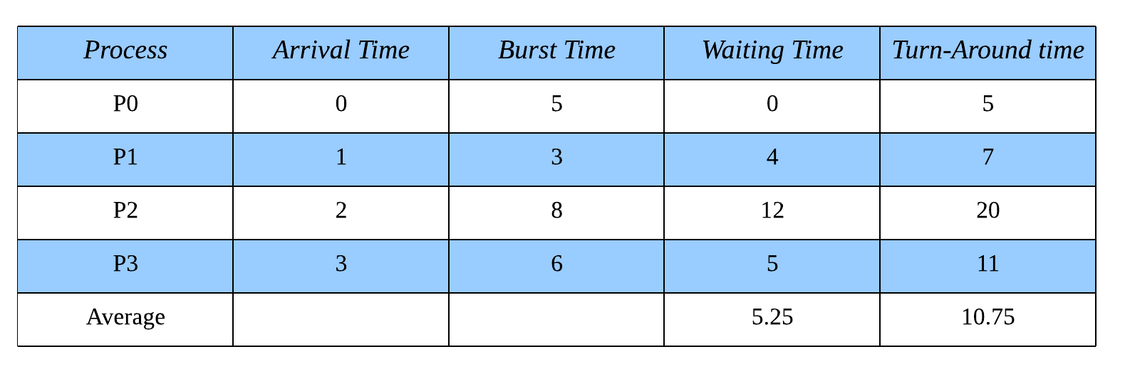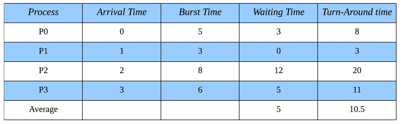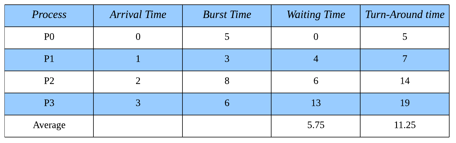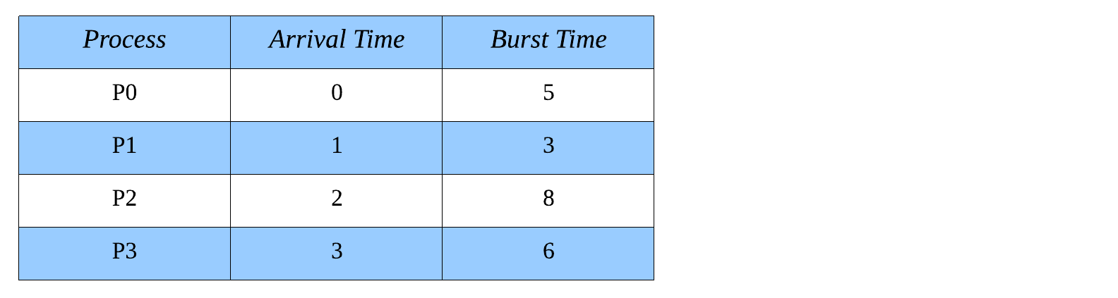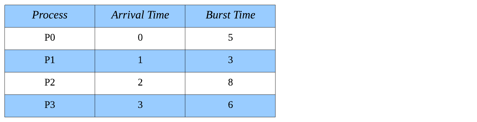 P0가 끝난 시점에서 P1, P2, P3 모두 요청이 도착한 상태이므로 셋 중에서 가장 Burst Time이 짧은 P1를 선택합니다. 만약 P1의 Arrival Time이 5보다 컸다면 P0이 끝난 시점에서 P1은 요청되지 않았으므로 고려되지 않았을 것 입니다.
