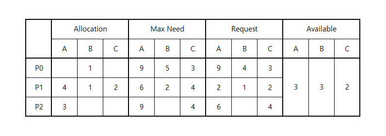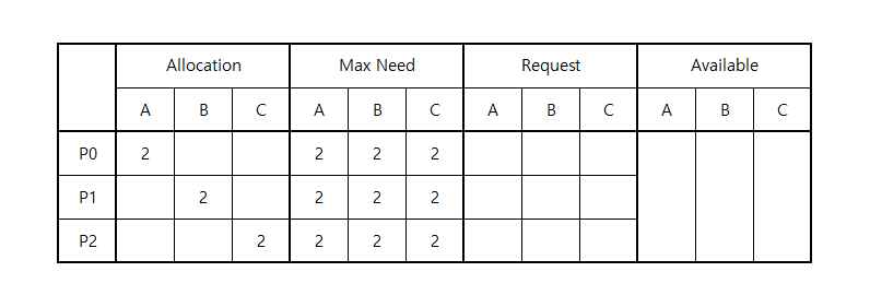 Available: 현재 시스템의 가용자원Allocation: 각 작업이 점유중인 자원 정보Max Need: 각 작업이 필요로하는 자원의 최대량Request: 각 작업이 현재 요청한 자원 정보