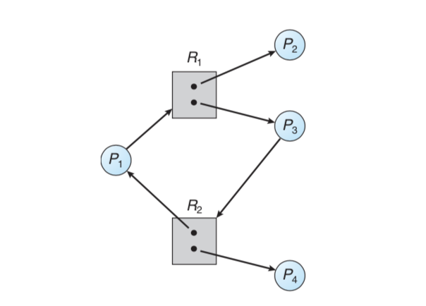 각 자원이 여러개 존재하는 경우에는, 사이클이 있다고 반드시 데드락인 것은 아닙니다. 위의 그림에서는 P4 → P3 → P1 순서대로 작업이 완료될 수 있습니다.