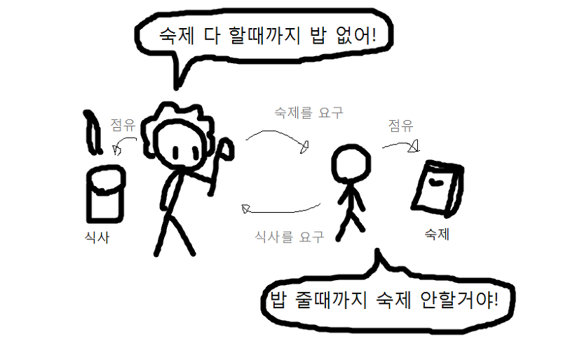이전 챕터인 프로세스 동기화을 떠올려보면 공유자원을 요청한 작업은 해당 공유자원이 자신에게 할당될 때 까지 대기하고 있음을 알 수 있습니다. 그러나 지금까지는 공유자원이 1개인 작업만을 이야기했지만, 공유자원이 2개 이상 필요한 작업의 경우에는 어떨까요?