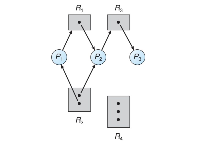 사이클이 없다면 교착상태도 아닙니다. 위의 예시에서 P3이 작업을 완료하면 P2가 진행할 수 있고, P2가 작업을 완료하면 P1이 진행할 수 있기 때문입니다.