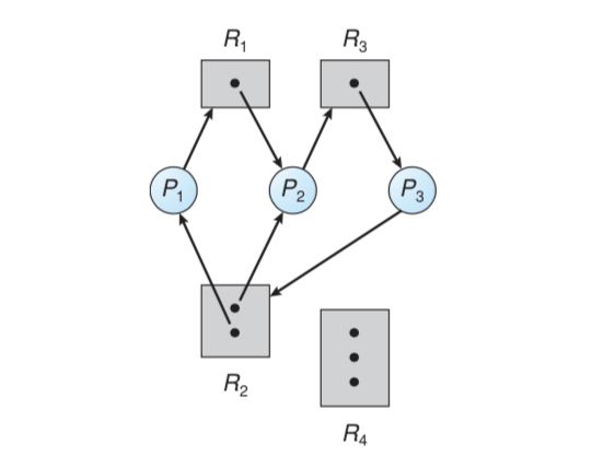 사이클이 없다면 교착상태도 아닙니다. 위의 예시에서 P3이 작업을 완료하면 P2가 진행할 수 있고, P2가 작업을 완료하면 P1이 진행할 수 있기 때문입니다.